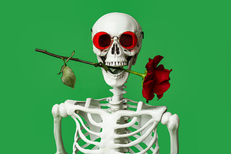 Human skeleton with sunglasses holding rose flower in mouth on green background