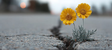 Resilience and Determination Yellow Flowers Blooming Through the Asphalt Crack in Urban Landscape