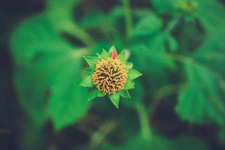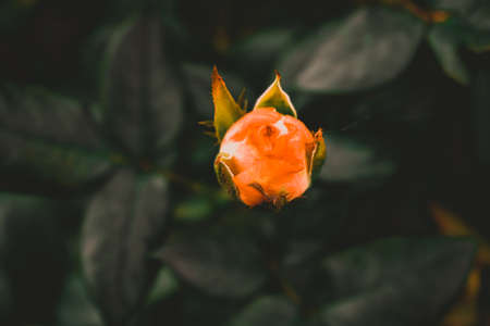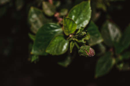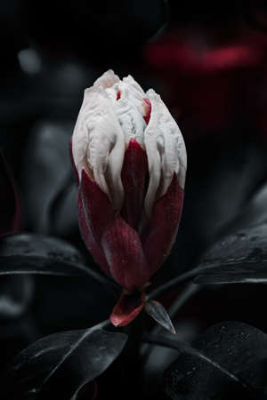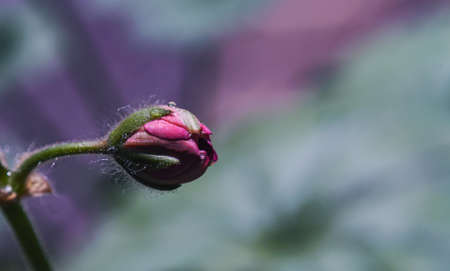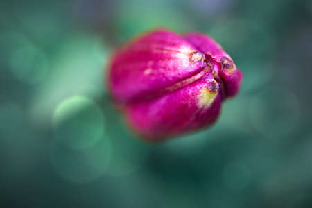 Flower in bud, isolated against a natural green and red background, selective focus.