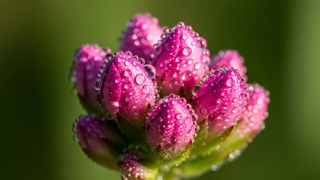 Macro image of a cluster of vibrant pink flower buds, each tip covered in tiny, sparkling water droplets against a blurred green background.
