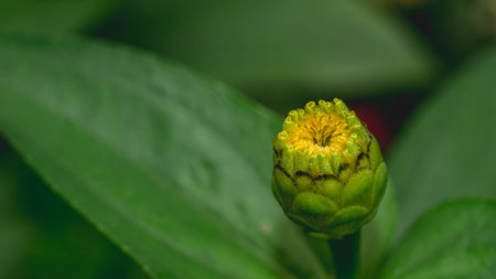Bud of Zinnia flower start to bloom. Zinnia bud with green leaves