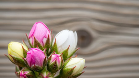 Pink showing close up of delicate pink white and yellow flower buds with fuzzy green sepals against a soft focus...