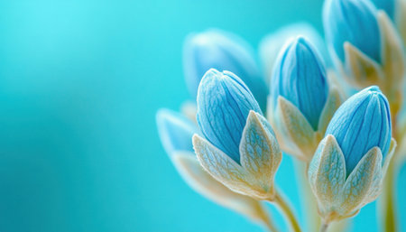 Macro photography showcasing the delicate beauty of emerging blue flower buds against a vibrant turquoise backdrop