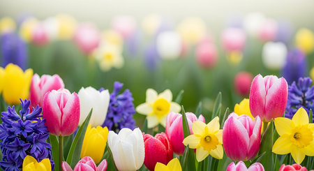 Spring showing vibrant spring flower bed with tulips daffodils and hyacinths in full bloom. resolution use.