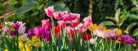 Colorful tulip flowers bloom in the spring garden. Natural floral background.