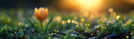 A beautiful yellow flower stands tall in a field, illuminated by the soft glow of early morning light. Dewdrops cover the surrounding grass and plants, creating a fresh and serene atmosphere