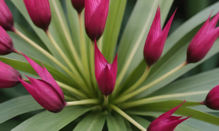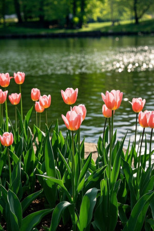 A colorful garden with a variety of flowers including pink, yellow, and orange tulips. The flowers are arranged in a way that creates a sense of harmony and balance. The garden is a beautiful