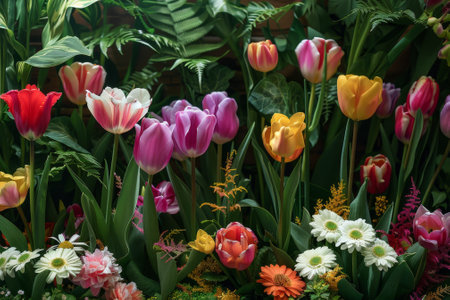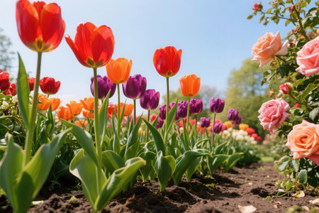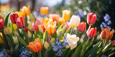 A colorful array of tulips in full bloom, capturing the vibrant essence of spring in a sunny garden.