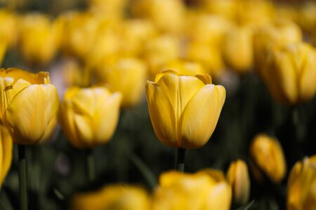 A vibrant field of yellow tulips basking in the warm glow of the setting sun.