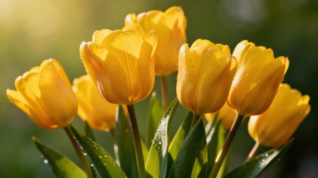 Cluster of six vibrant yellow tulips speckled with dew drops, dramatically highlighted by golden rim light and sun flare, contrasting against a lush, out of focus, deep green backdrop.