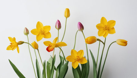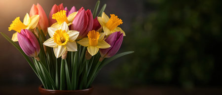 A close-up shot of a bouquet of fresh spring flowers including tulip.