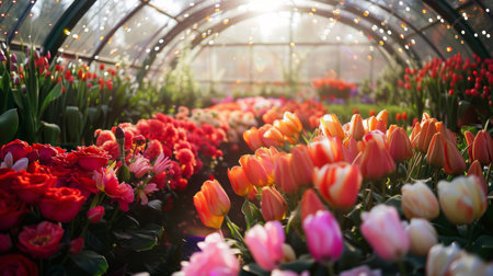Vibrant Tulip Display in Greenhouse During Late Afternoon Sunshine