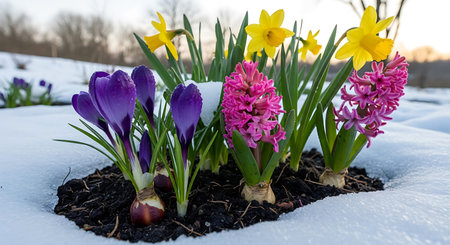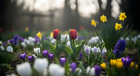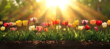 A vibrant garden scene featuring blooming tulips, hyacinths, and daffodils bathed in soft morning sunlight. The low-angle shot captures the fresh colors of spring against a blurred natural background.