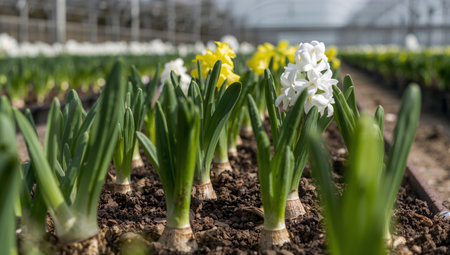 Bright yellow and white flowers grow in neat rows inside a greenhouse as sunlight filters through the glass roof.