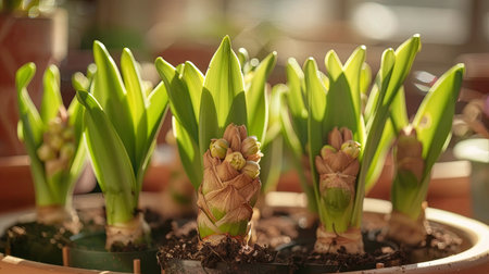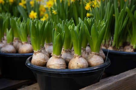 Young Hyacinthus orientalis bulbs planted in the ground - preparation for planting gardening flowers concept.