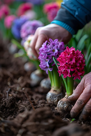 Gardener hands planting hyacinth flower in soil on backyard garden. Spring gardening works concept