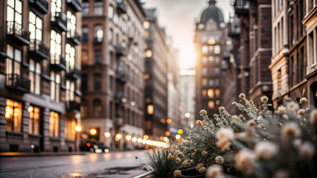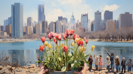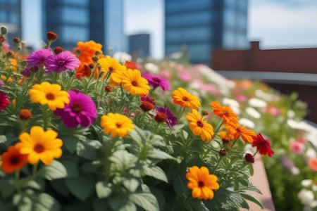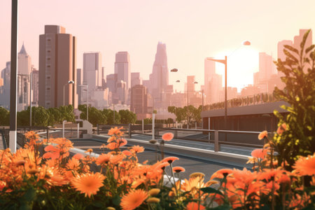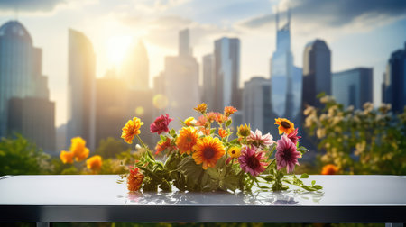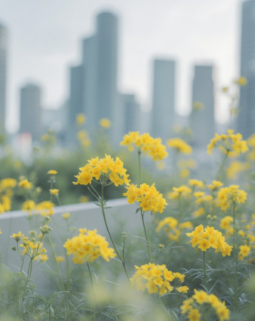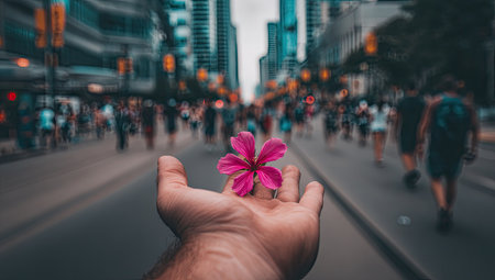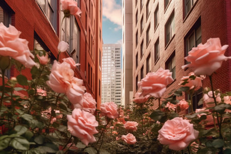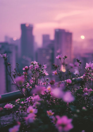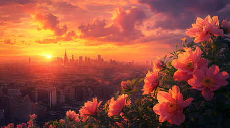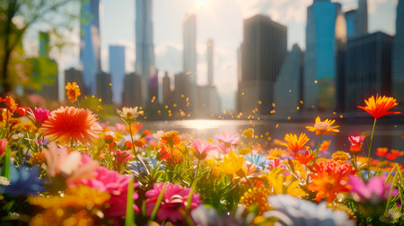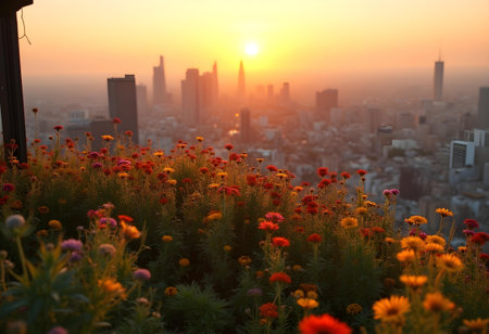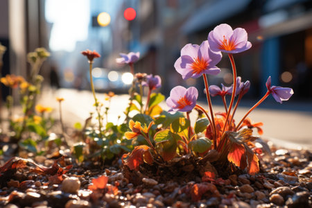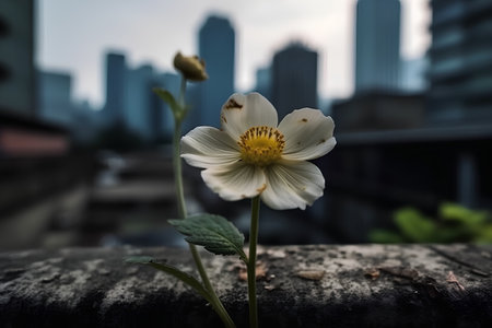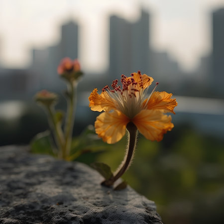 Vibrant flower blooms in ruined cityscape, symbolizing resilience and new beginnings