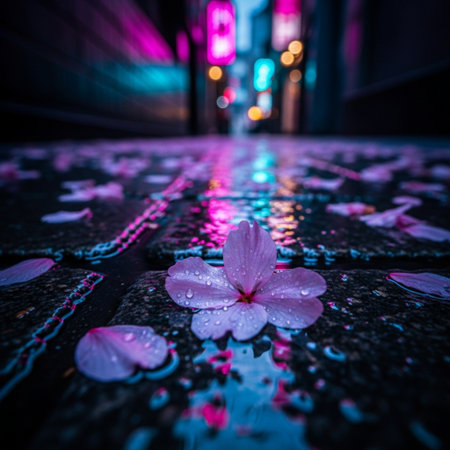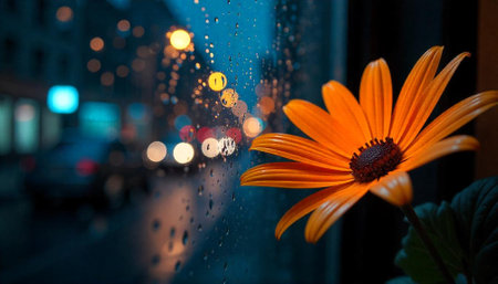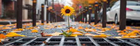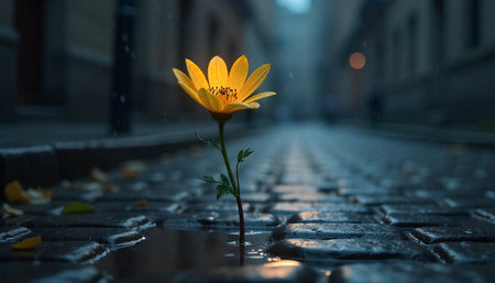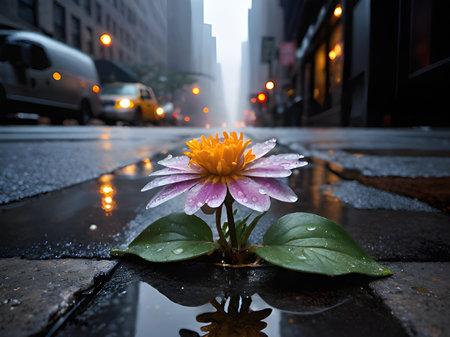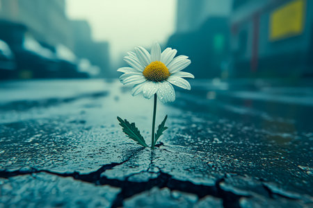 A resilient daisy emerges amidst rain-soaked, fractured pavement, symbolizing hope and beauty thriving in urban decay.