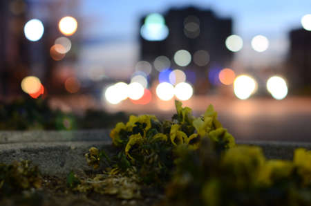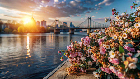 Bright yellow and red petunias in a planter in the foreground blurred view of the river embankment and city skyline horizontal shot natural light