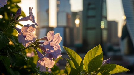 Jakarta, Indonesia - September 2022: The height of the building on Jalan Sudirman, Jakarta, after rain is seen from the pedestrian bridge of the loyal people of Budi Astra with flowers as foreground