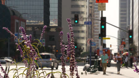 LOS ANGELES, CALIFORNIA, USA - OCT 30, 2019: People walking in metropolis, pedestrians on walkway in urban downtown. Citizens on street in financial district. City dwellers in LA among skyscrapers.