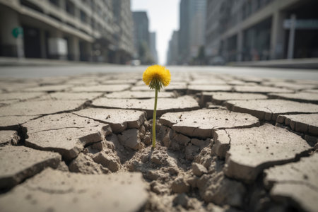 Dandelion growing through crack in asphalt, symbolizing resilience