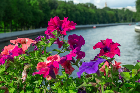 Colorful petunias by the river. Blooming petunias overlooking peaceful river with boats and lush summer landscape.