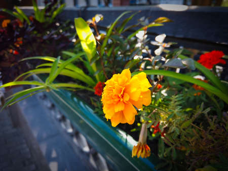 Marigold flowers are yellow and orange illuminated by the yellow rays of the sun.