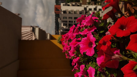 Pink and red petunias blooming on an urban balcony bring a touch of nature to the city