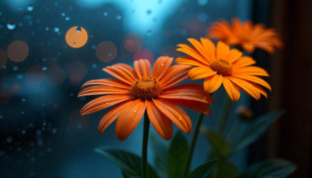 Close-up of a vibrant orange gerbera daisy, standing out against a dark backdrop. The mood is mysterious and elegant.