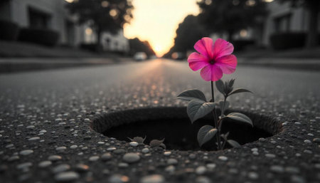 Purple blossom and green leaves pushing through a crack in dark asphalt pavement, symbolizing hope, perseverance, and strong natural growth in urban environment