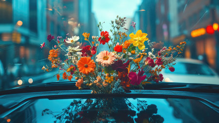 Colorful flowers in marble planter with San Francisco street and Clean Air Vehicle in city background, CA
