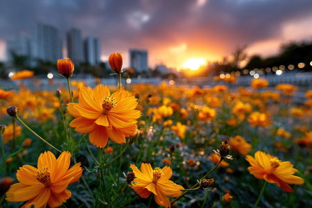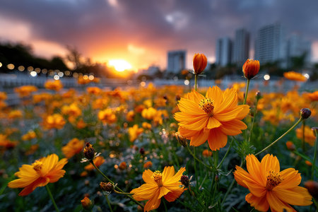 Sunlit yellow and orange flowers create a vibrant, cheerful scene in the garden. A close-up view of vibrant yellow and orange flowers basking in sunlight, creating a warm, inviting scene.