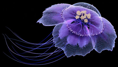 Glowing purple flower with translucent petals and delicate tendrils against a black backdrop