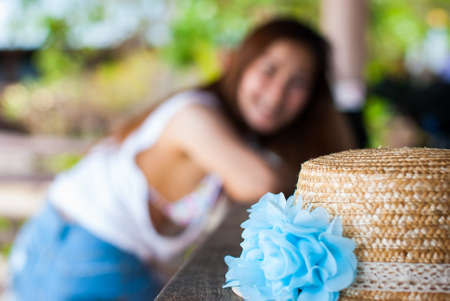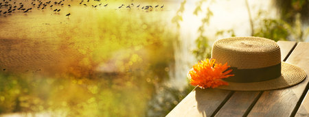 woman hat with orange flower on wood terrace in summer sunset at natural lake meadow water travel banner background