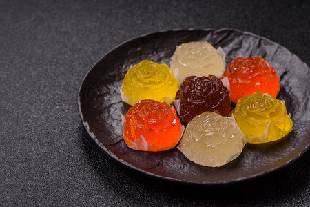 Jelly candies or homemade marmalade with different flavors on a dark concrete background