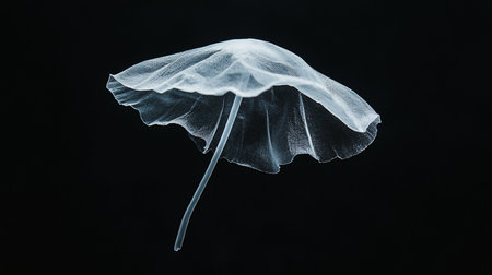 A translucent white fabric umbrella, resembling delicate lace, is suspended against a stark black background, showcasing its intricate texture and flowing form.
