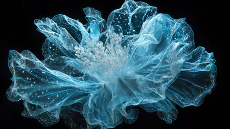 A detailed close-up of a luminous, ethereal blue object resembling a flower, showcasing its delicate, translucent petals and sparkling texture against a dark background.