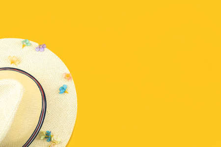 Women s summer straw hat on yellow background top view flat lay copy space. Summer travel vacation concept, single item. Text SUMMER from letters and field chamomiles flowers on yellow.