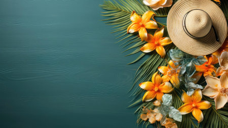 Summer vacation flat yellow background with straw hat and tropical flowers, holiday and festive flat lay composition with copy space, top view