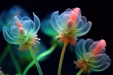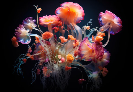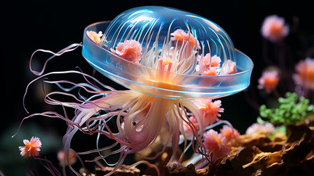 Closeup of jellyfish with its ethereal grace and enchanting color gradients that adorn its translucent body floating on dark background