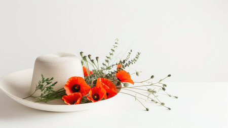 A tan fedora hat lays on a white surface next to a bouquet of bright red poppies.