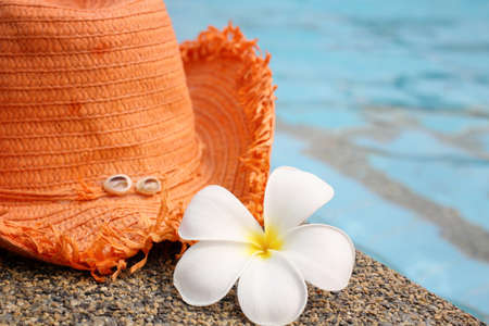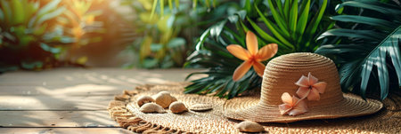 Straw hat decorated with frangipani on a tropical background with sunlight, perfect for summer and vacation advertising. With Generative AI technology.