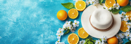 A colorful hat sits beside fresh oranges on a vibrant blue surface,.