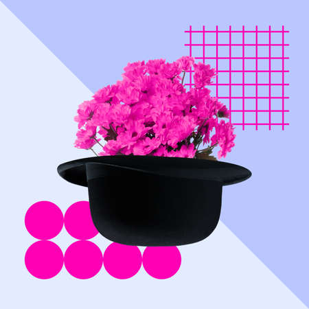 Contemporary art collage. Black hat with bunch of pink, crimson chrysanthemums on modern illustrated background. Concept of creative work, different emotions, new look at objects.