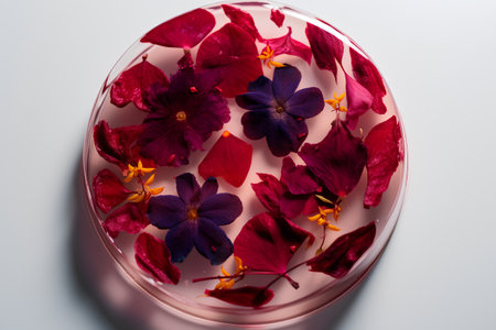 Two pink flowers on ice cubes with a small flower in the middle, AI