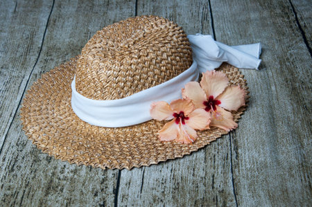 Straw hat, sunglasses and flowers on sandy beach. Summer vacation concept