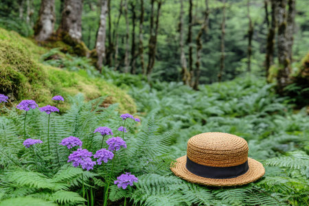 Straw Hat Resting Amidst Purple Flowers and Ferns in a Lush Forest
