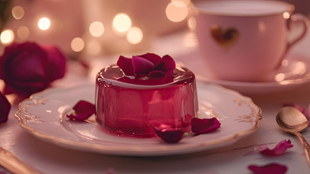 Close-up of rose-infused jelly dessert topped with edible petals, paired with a creamy rose latte in an intimate Valentine's Day setup.