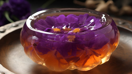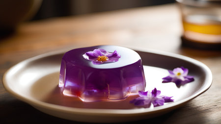 Colorful jelly pudding decorated with flowers on a plate on a wooden table